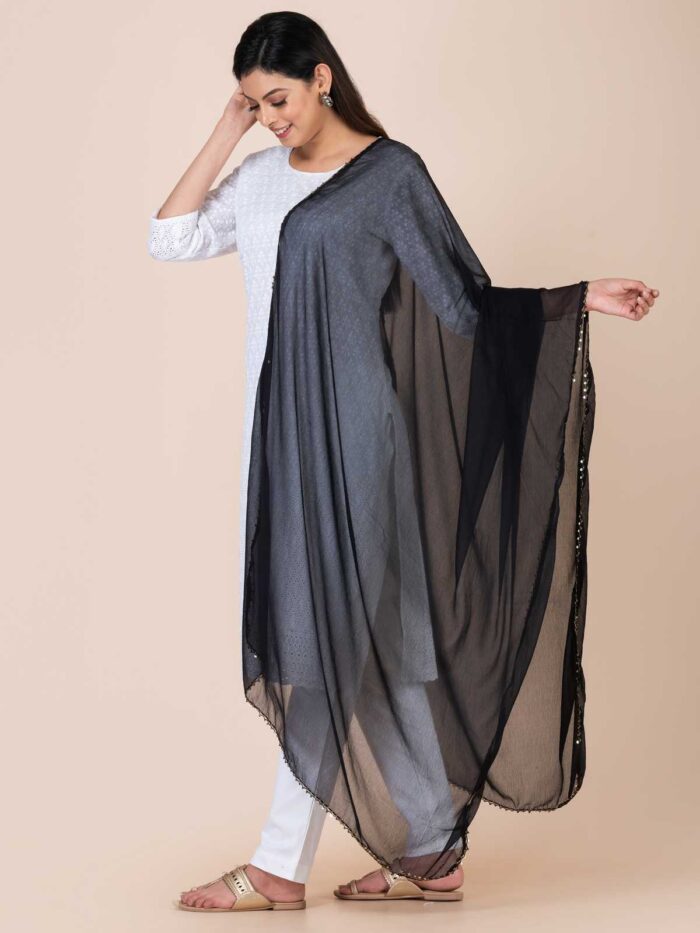 A chiffon side sequence work plain dupatta is a delicate and elegant piece of attire. Let’s break down its components: